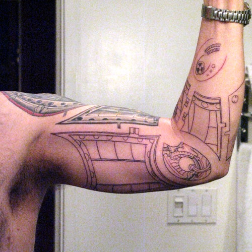 There’s a certain serenity to getting tattooed. You sit (or lie) back on the chair or table and agree to let someone cause you tremendous pain for several hours and scar you for life.What gets you through the pain is the promise of how marvelous the scar will be. I’ve been waiting months to have Justin turn this into this.