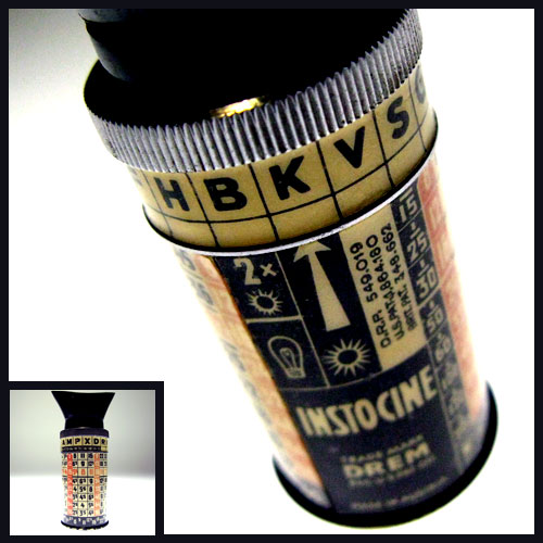 Spin the knurled collar – it holds letters matching the ones inside the eyepiece that seem to compare against a scale of f. stops, exposure lengths and frame-per-second numbers printed on the barrel.