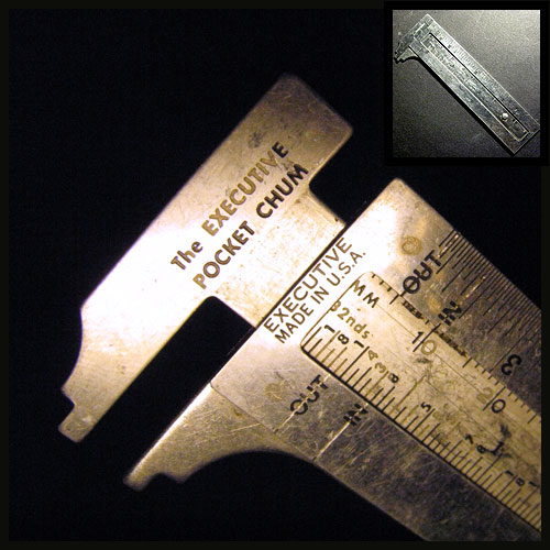 The Executive Pocket Chum measures the thickness and thinness of things to the 32nd of an inch, ambulance or the fraction of a millimeter.One can imagine it monitoring the precision of millwork tumbling from Gary, Indiana steel plants into assembly-line catch-bins by the millions in 1950s.